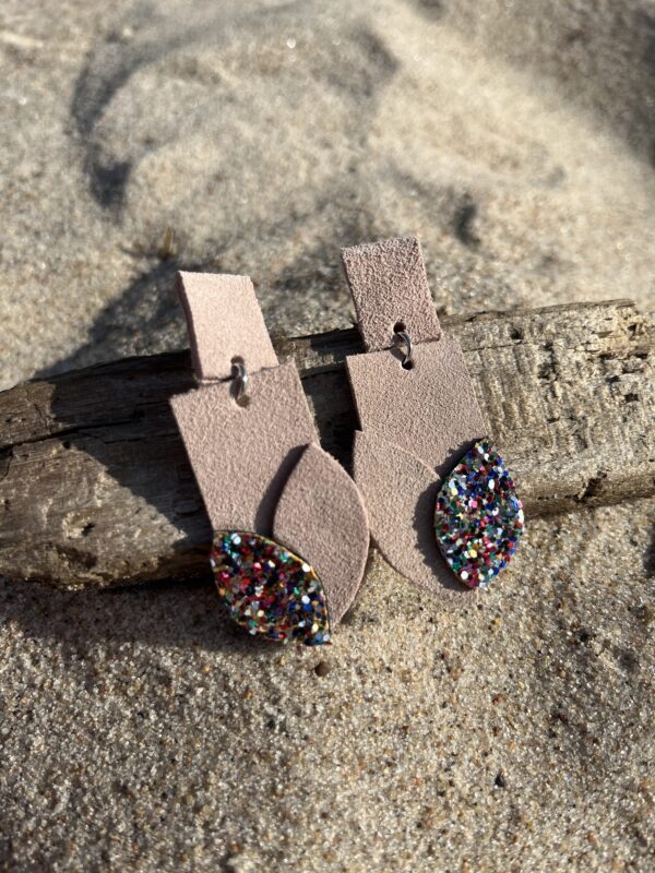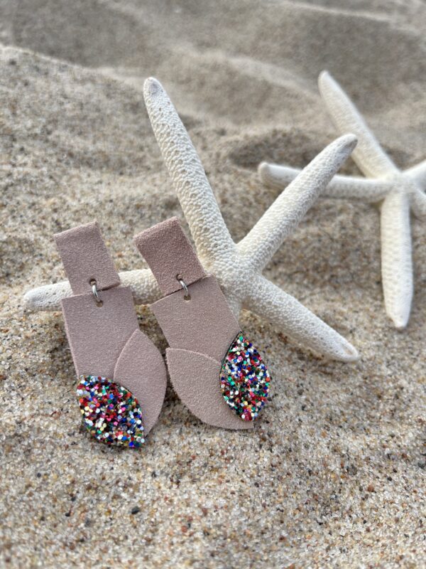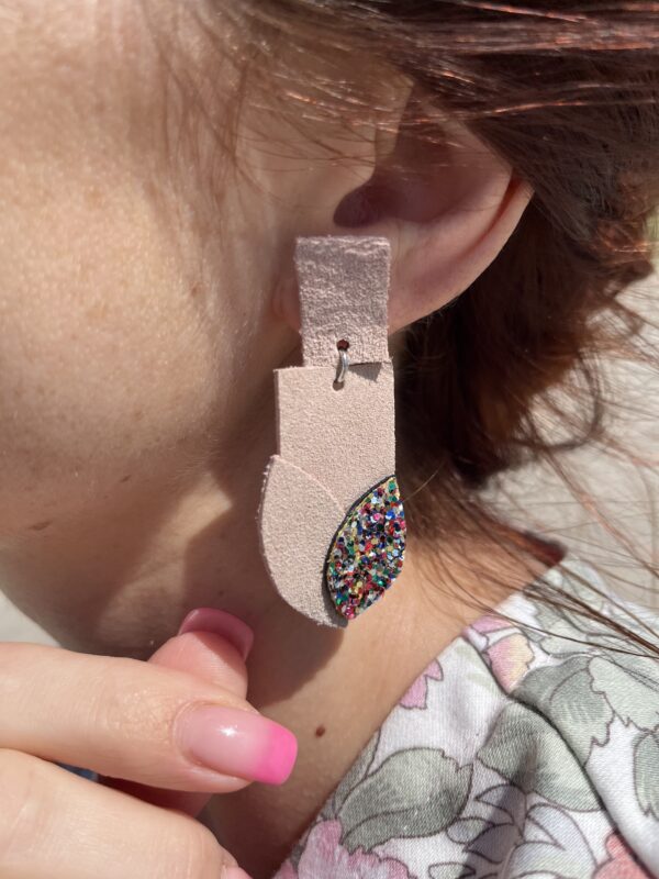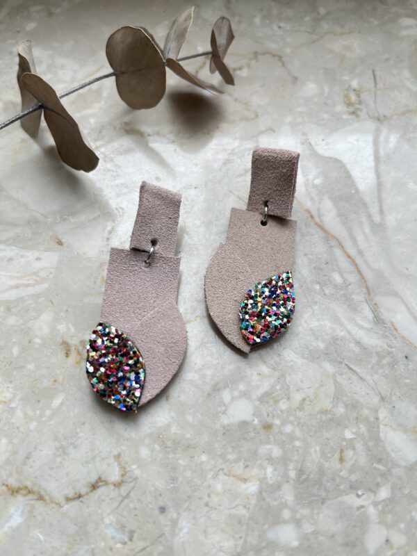 Wykonane ręcznie, ze staranną precyzją. Sztyfty: Stal chirurgiczna Materiał: skóra zamszowa i brokat Lekkie i efektowne