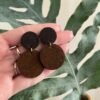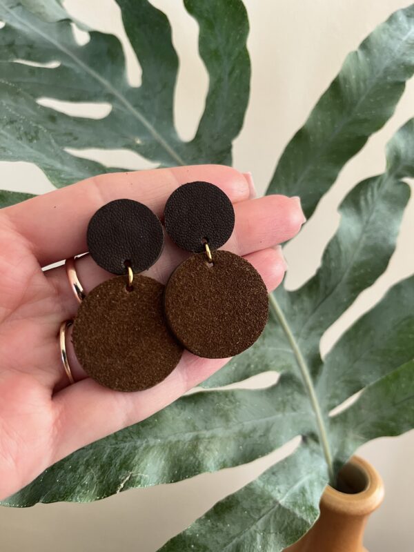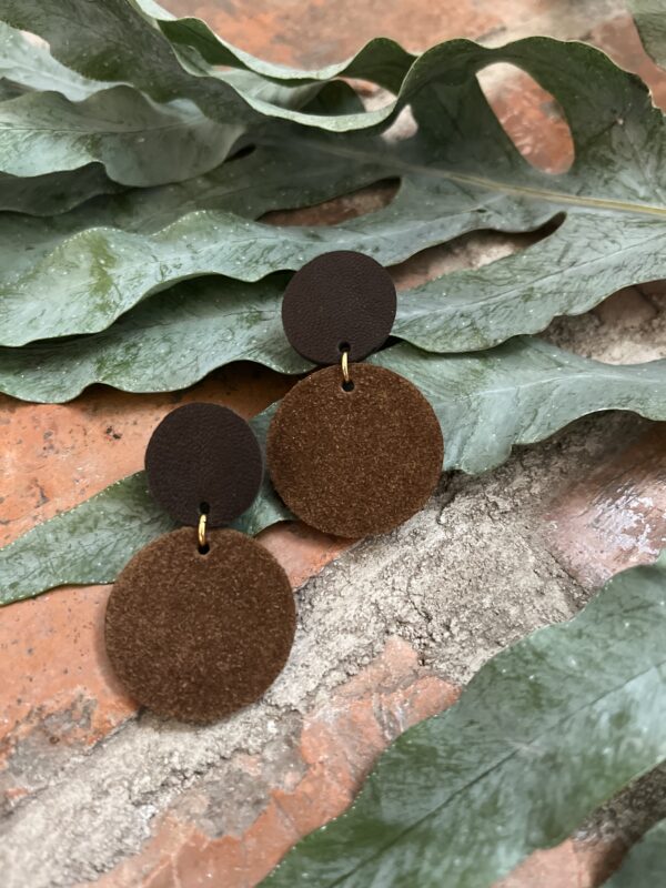 Model „Brązowe Koła” to lekkie, wiszące kolczyki wykonane z połączenia zamszowej i licowej skóry naturalnej w odcieniach ciepłego brązu.