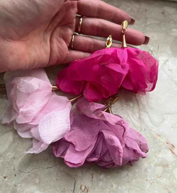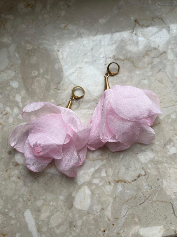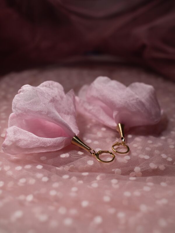 Odkryj unikatowe kolczyki, które zachwycają subtelnym urokiem szyfonowych kwiatów w kolorze pudrowego różu.