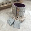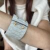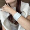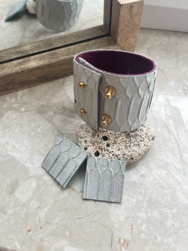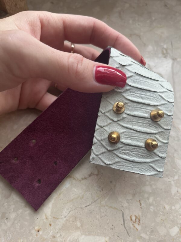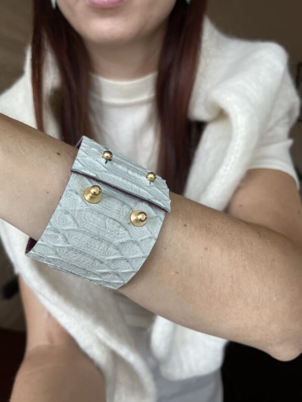 w odcieniach bieli i turkusu. Wewnętrzna warstwa bransolety to miękka włoska skóra welurowa w odcieniu fuksji.