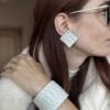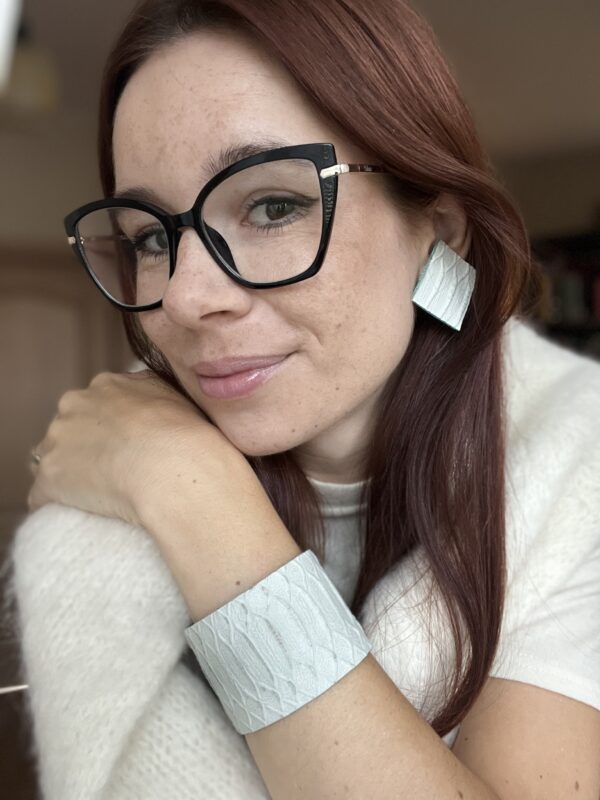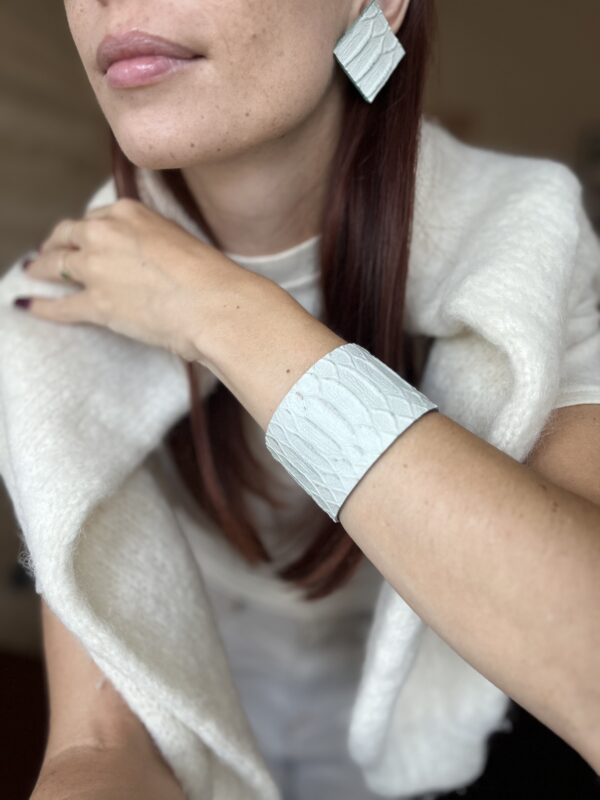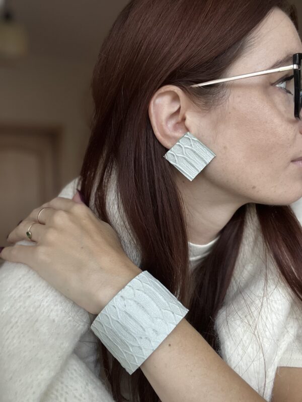 Bransoleta skórzana w odcieniach bieli i kolczyki.