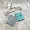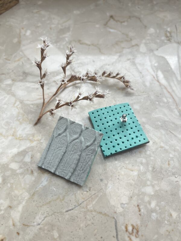 Kolczyki wykończone są skóra licową dziurkowaną w odcieniu turkusu, co pięknie komponuje się kolorystycznie.